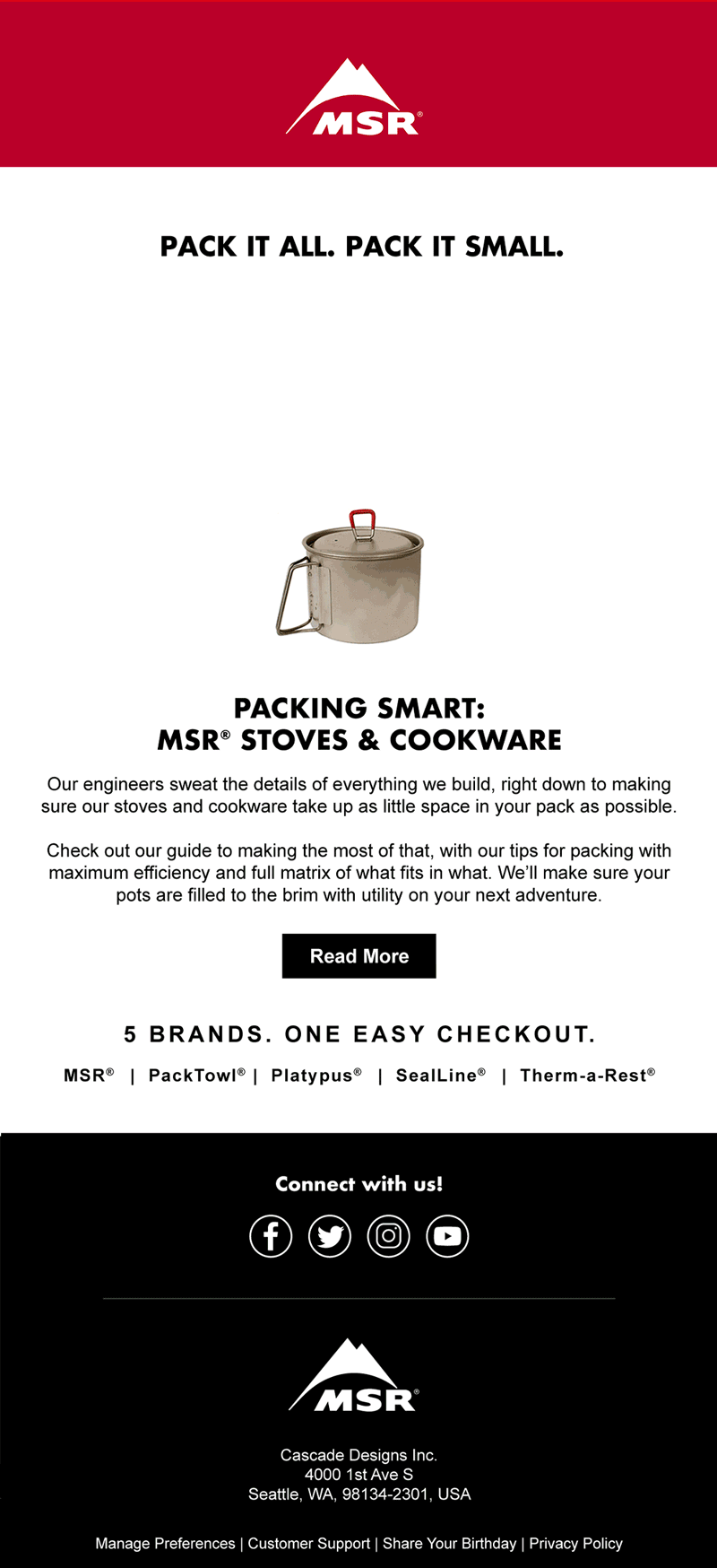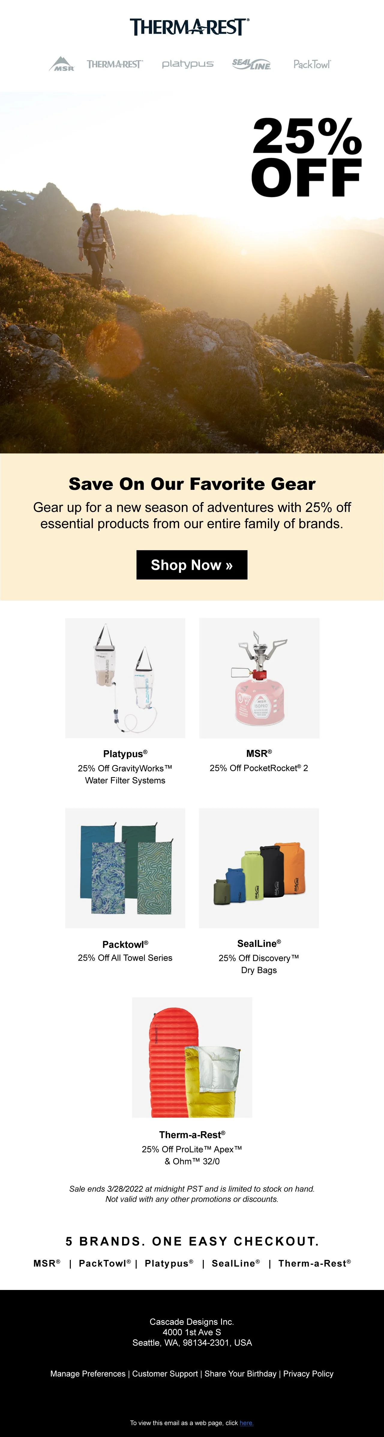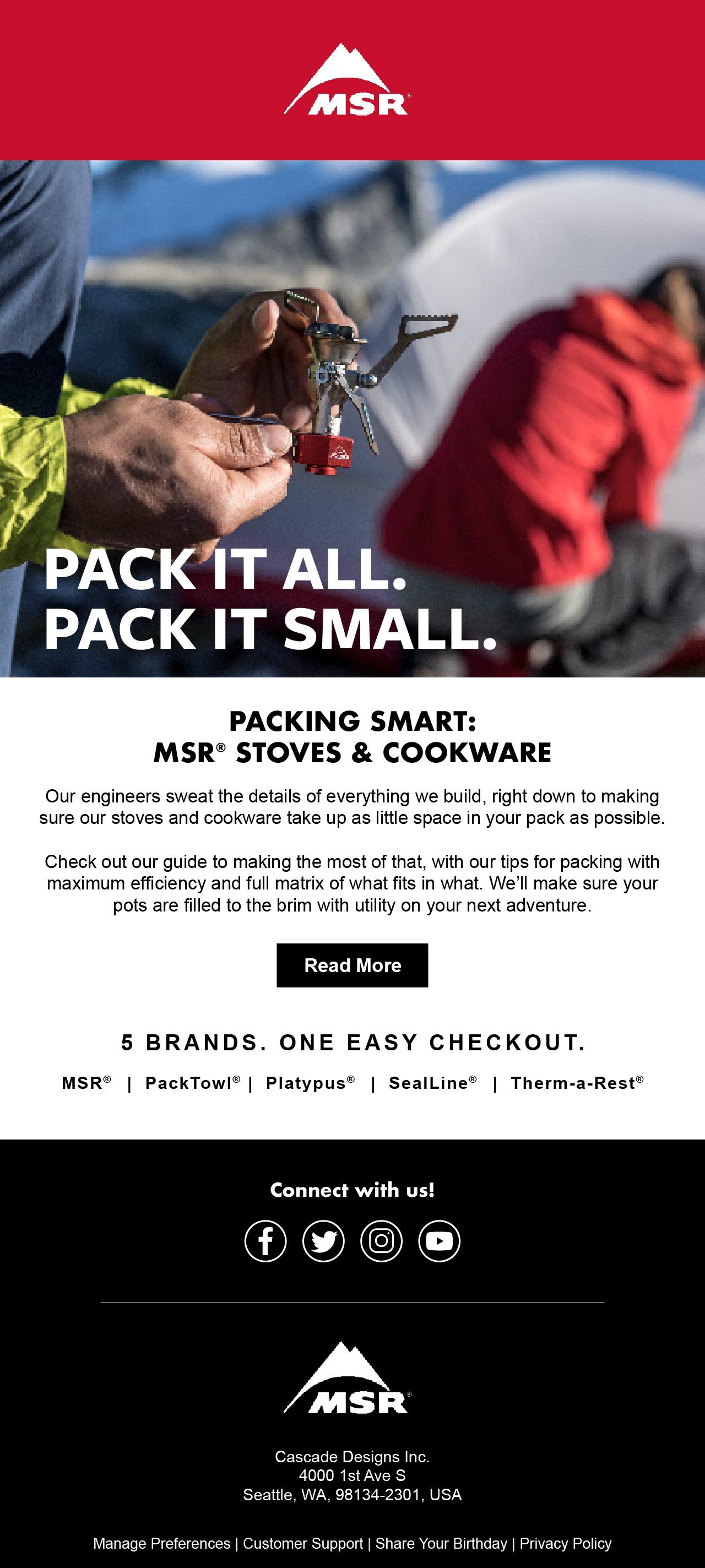 Cascade Designs is the parent company of the outdoor brands MSR, Therm-a-Rest, Platy, SealLine, PackTowl and Varilite. I worked on a variety of projects across all the brands including social media and blog posts, emails, packaging, product labeling, trend research, concept illustrations, image manipulation and more.