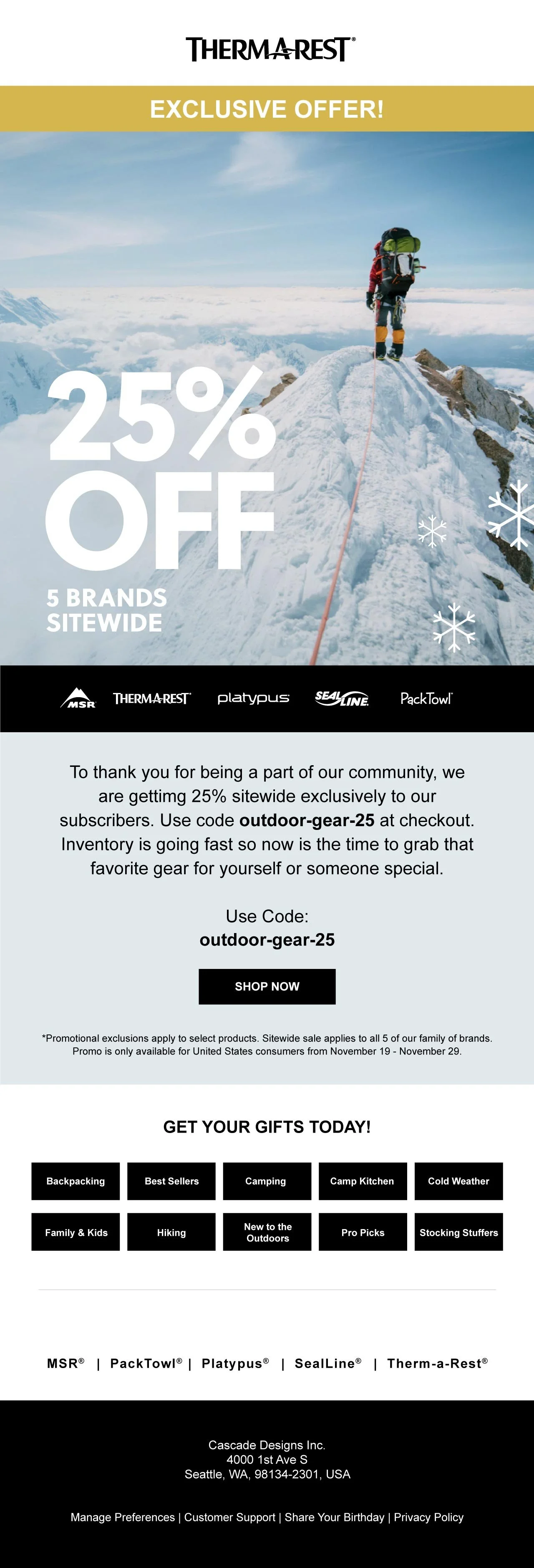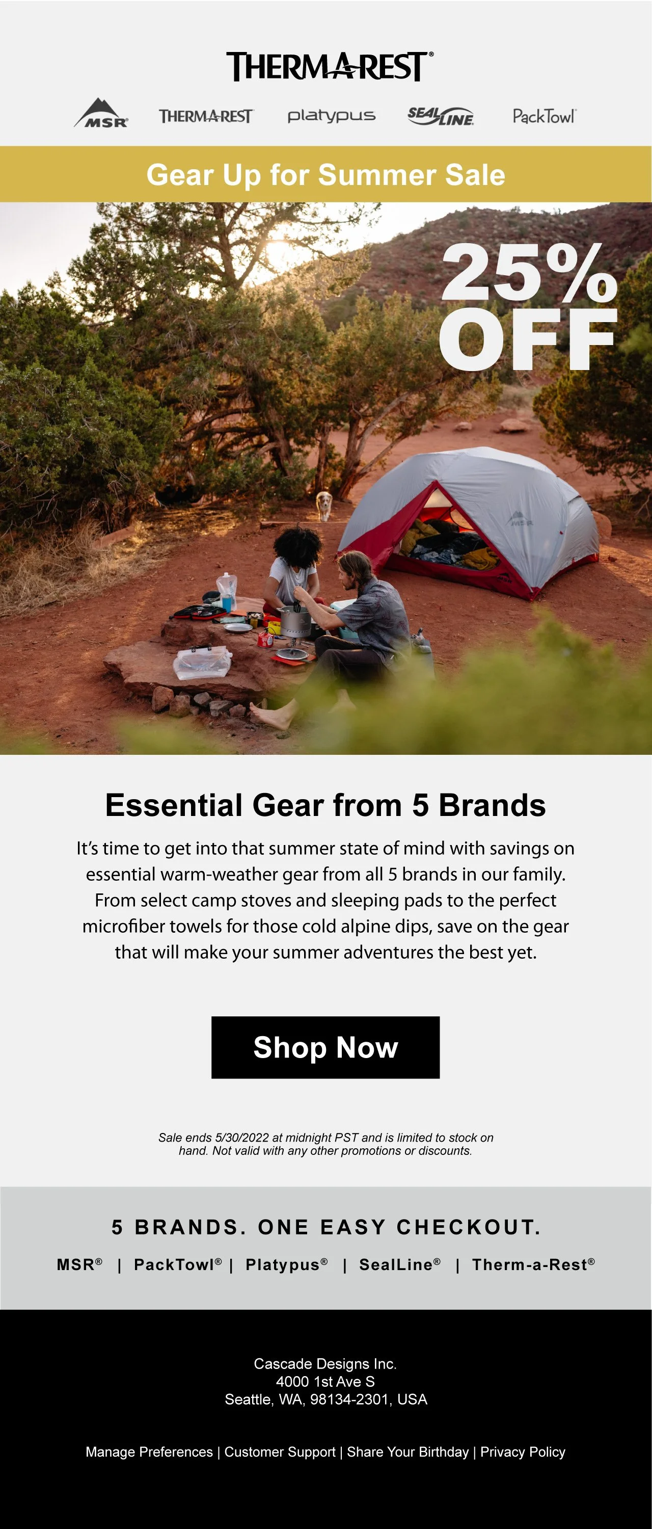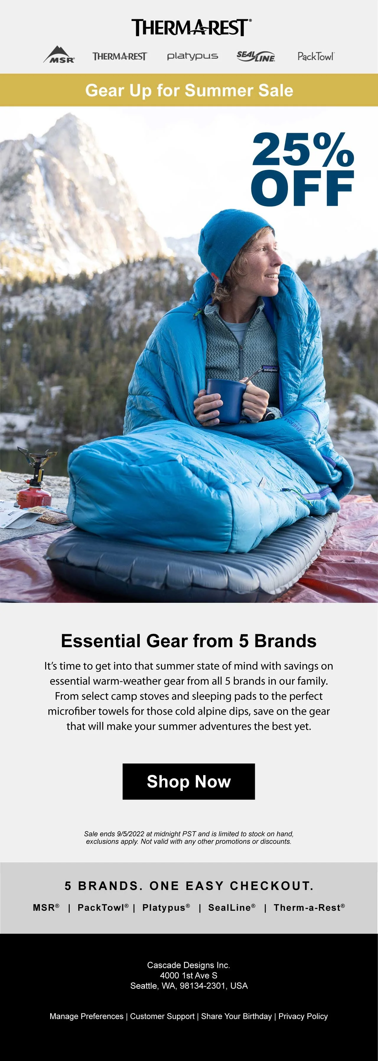 Cascade Designs is the parent company of the outdoor brands MSR, Therm-a-Rest, Platy, SealLine, PackTowl and Varilite. I worked on a variety of projects across all the brands including social media and blog posts, emails, packaging, product labeling, trend research, concept illustrations, image manipulation and more.